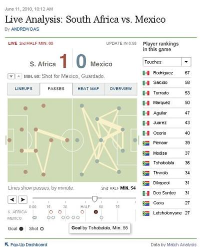 Escribo este post durante el descanso del partido de México contra Sudáfrica por la Copa del Mundo, y como todo fanático, esta interrupción me permite sacar los ojos de la TV y volver a la realidad. Por medio de un tweet de Ramón Salaverría me entero de una nueva funcionalidad que ha debutado en los medios digitales de mano del new York Times.