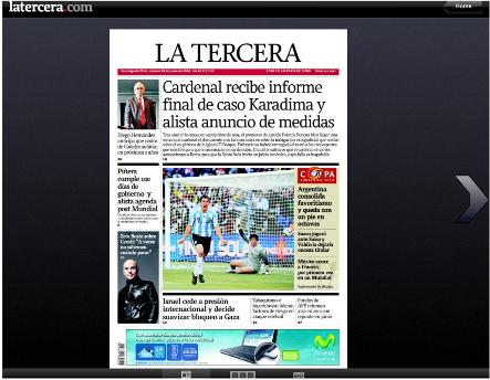 Mientras El Mercurio anunció hace un tiempo que parte de su estrategia digital incluiría cerrar el acceso gratuito a los contenidos de la edición impresa, para explotarla en múltiples plataformas incluyendo el iPad, La Tercera rápidamente reacciona y adapta sus contenidos para este dispositivo.